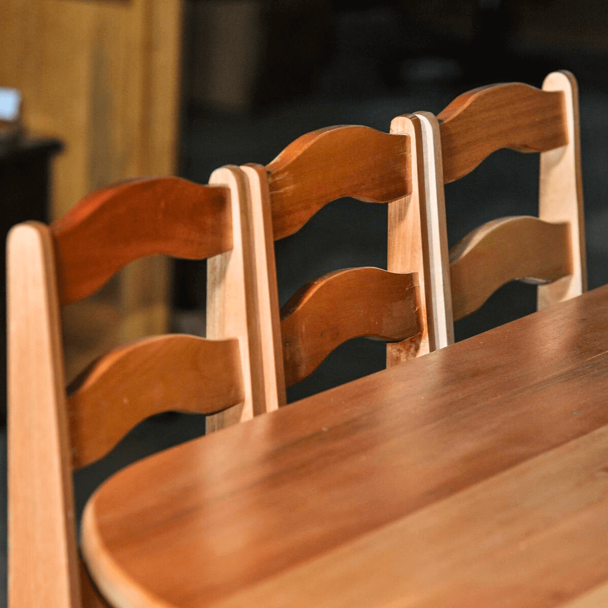 As cadeiras que acompanham o kit são cuidadosamente selecionadas para complementar a mesa oval em design e funcionalidade. Também confeccionadas em madeira maciça clara, elas oferecem: