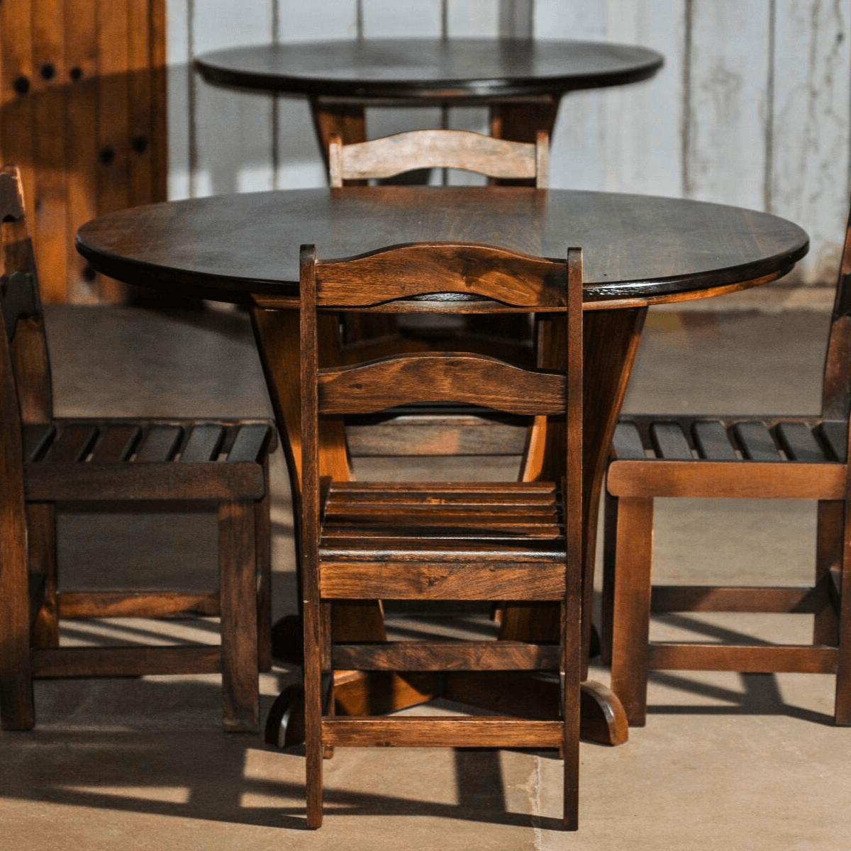 As cadeiras que acompanham o kit são cuidadosamente selecionadas para complementar a mesa redonda em design e conforto. Também confeccionadas em madeira maciça escura, elas oferecem: